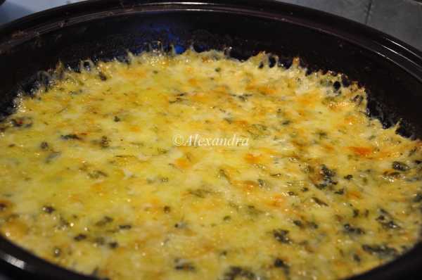 Поместить сотейник в разогретую духовку или под гриль до зарумянивания верха. Можно перед запеканием переложить в глиняные порционные мисочки или горшочки