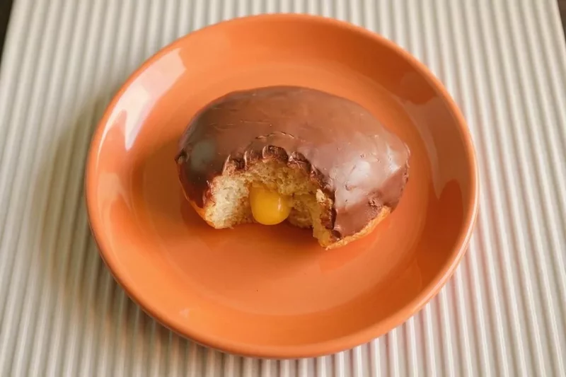 Когда тесто будет готово, обмять его, отрывать небольшой кусочек, сделать лепёшку, внутрь положить 1 чайную ложку крема, защипать, сделать шарик, потом приплюснуть его.