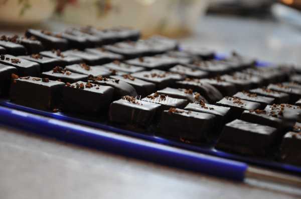 СБОРКА КОНФЕТ: Пласт двухслойной начинки покрыть с одной стороны тонким слоем шоколада рабочей температуры 32С и быстро разровнять шпетелем