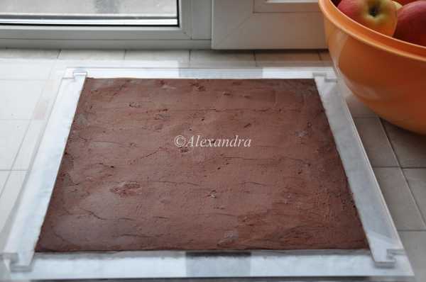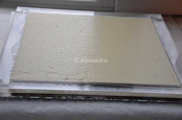 Сразу же вылить жидкий ганаш (начинку) в рамку 30х30 см высотой 8мм, помещенную на лист пергамента в металлический противень, разровнять шпателем и оставить в прохладном месте на 30 мин
