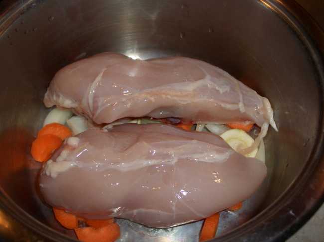На дно кастрюли с толстым дном кладу крупно порезанные овощи, сверху на овощи куриную грудку. Воду и соль добавлять не нужно!