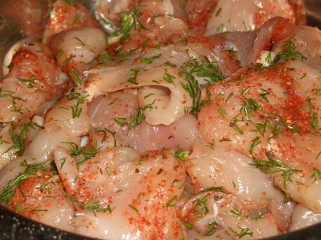 Добавить к мясу соль, специи, нарезанный мелко укроп, поставить мариноваться пока готовим кляр.