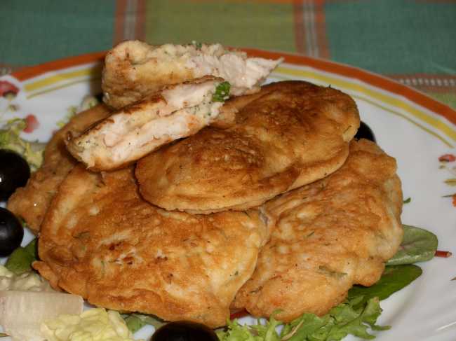 Брать вилкой по кусочку мяса, обмакивать его в тесто, аккуратно выкладывать на горячую сковороду. Выпекать с двух сторон до готовности и румяного цвета.