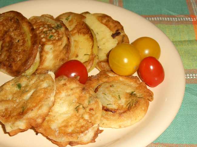Вверху кусочки яблок, внизу кусочки лука в кляре.