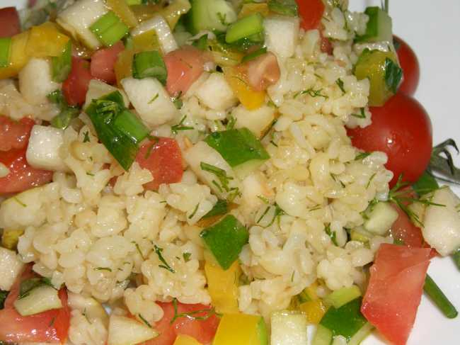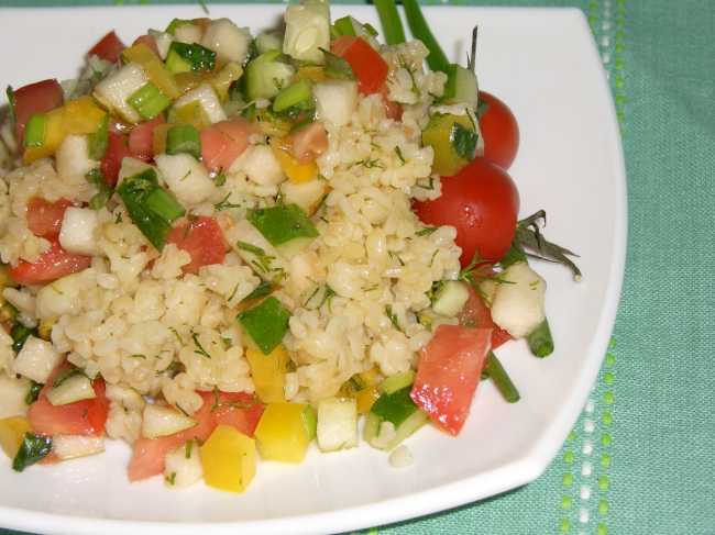 Получился очень вкусный и рассыпчатый салат из пшеничной крупы булгур и овощей!