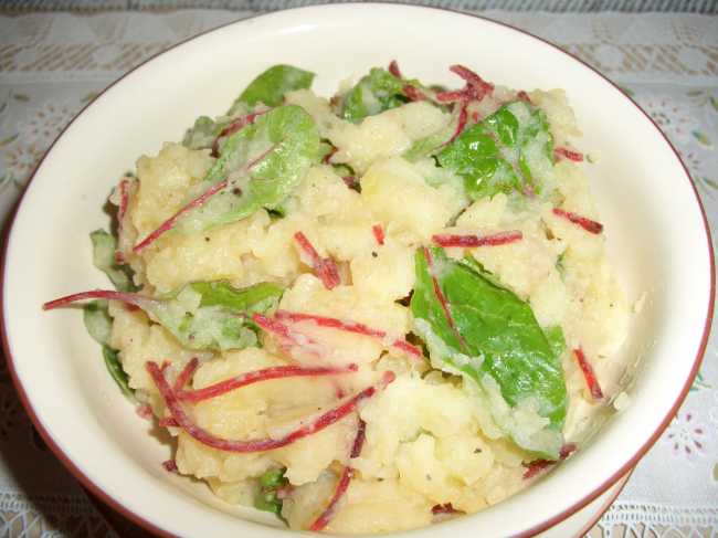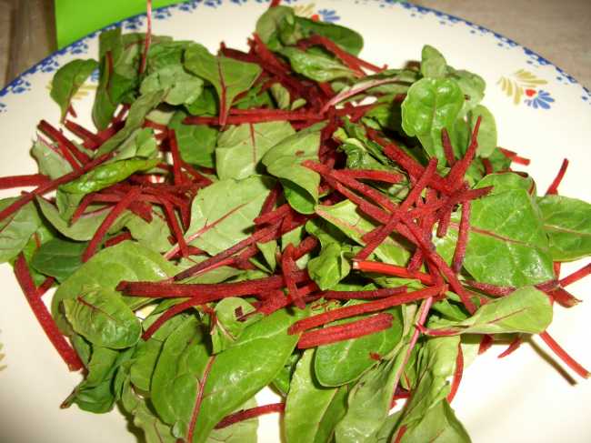Добавить свежие листья мангольда и свеклу нарезанную соломкой.