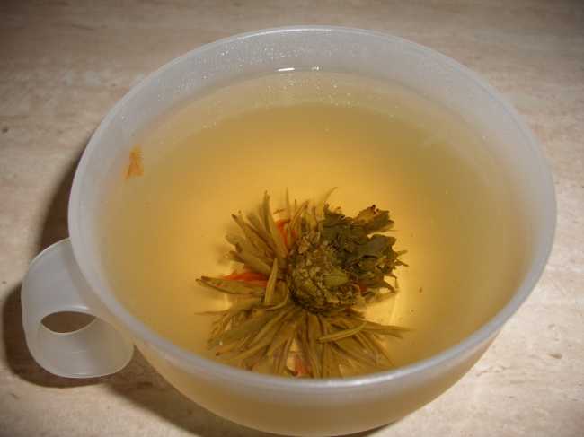 Положить в миску 1-2 бутона чая «жасмин», залить кипятком, дать настояться 5-10 минут.