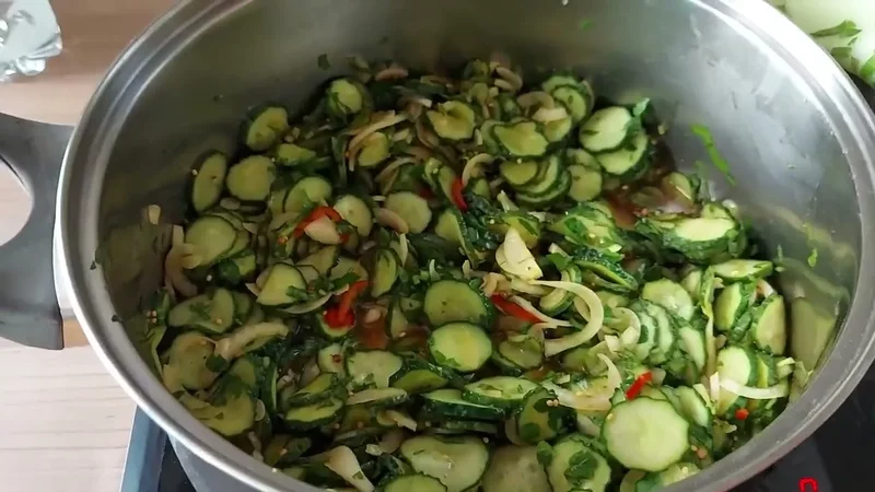 Огурцы, лук, перчик чили шинкуем кружочками, добавляем кинзу, туда же все ингредиенты и оставляем на 3 часа.