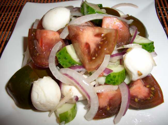 Хотела сделать салат из одних томатов, но в последний момент добавила свежий огурец, в принципе он ничего не дал, поскольку пресный по вкусу.