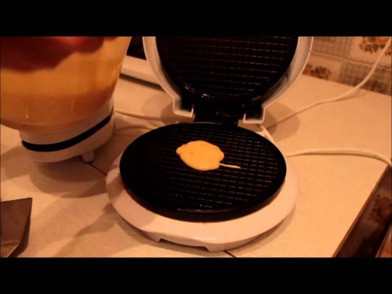 4) На разогретую вафельницу выкладываем ложку теста и закрываем, прижимаем, выпекаем. Достаем и горячей сворачиваем в трубочку тоненькую. Далее наливаем следующую порцию.