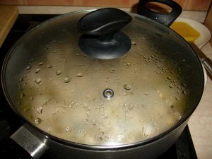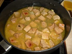 Добавляю к мясу сухое вино, опять закрываю крышку, и тушу до выкипания жидкости.