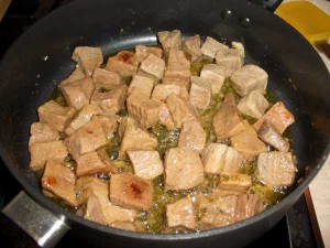Тушу мясо на сильном огне до состояния, пока мясо не станет серого цвета, перемешиваю.