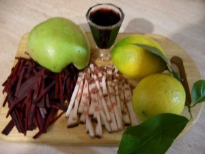 Свеклу нарезать тонкой соломкой, для чего я использовала терку Бёрнер.