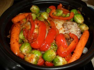 Разогреть в сковороде сливочное масло, добавить все овощи и быстро обжарить их до карамелизации, чтобы они стали горячими, пропитались вкусностями друг от друга. Добавить при обжарке немного соли и специй по вкусу.