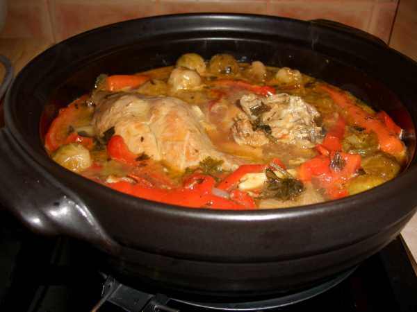 Поставить керамическую кастрюлю на огонь, закрыть крышкой, дождаться закипания, затем убавить огонь до минимума, тушить мясо до готовности. Кастрюля разогревается очень быстро, и даже на медленном огне хорошо кипит, поэтому пришлось подставить под кастрюлю пламярассекатель.