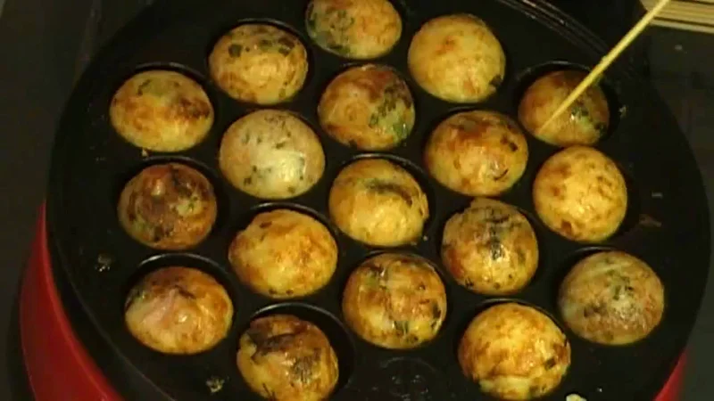 и раскладываем начинку. Как только тесто загустело, пончики (простите, такояки, или, учитывая отхождение от оригинала - болл-яки) переворачиваем