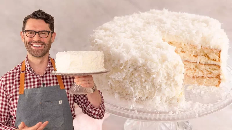 Поставить в холодильник застывать. Удалить бортик и посыпать кокосовой стружкой.