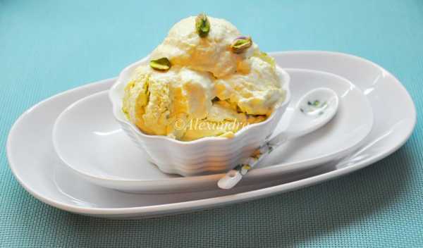 Если есть мороженица — приготовить мороженое согласно инструкции, в конце добавить фисташки (рецепт дан на 1 порцию для приготовления в мороженице объемом 1,5 л). Если мороженицы нет — добавить фисташки, выложить в пластиковый контейнер, накрыть крышкой, убрать в морозильную камеру. Несколько раз вынимать контейнер и перемешивать массу, пока она не застынет до состояния обычного мороженого