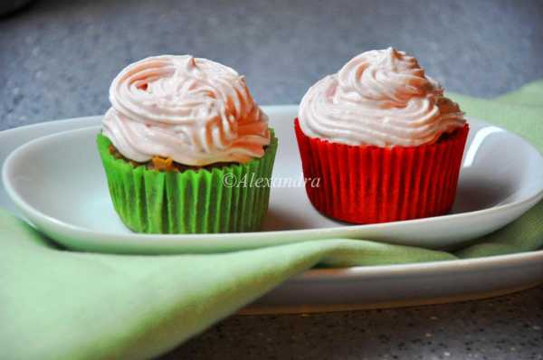 Нанести на остывшие кексы крем из кондитерского мешка и украсить ломтиками клубники.