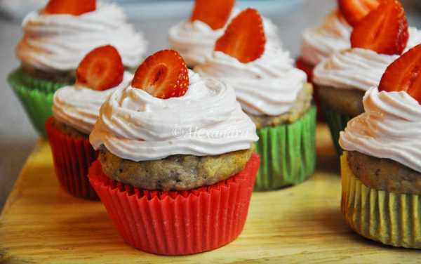 Упоительно ароматные капкейки со свежей клубникой из цельнозерновой муки с отрубями и легким кремом; без сахара, с пониженным содержанием жиров.
