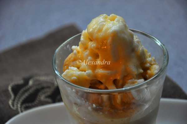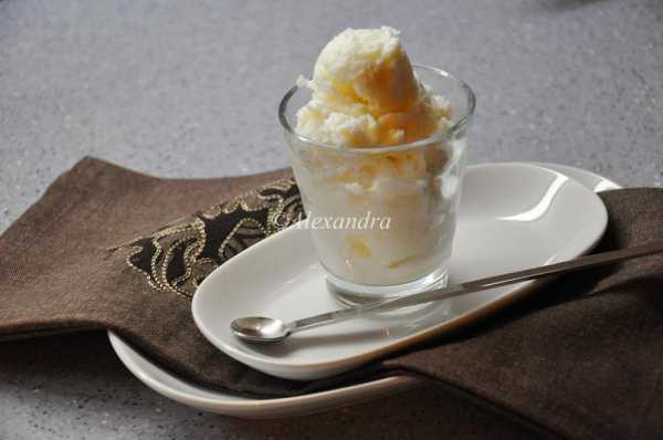 Если есть мороженица — приготовить мороженое согласно инструкции (рецепт дан на 1 порцию для приготовления в мороженице объемом 1 л), в конце по желанию добавить куантро или другой крепкий алкоголь. Если мороженицы нет — добавить куантро (по желанию), выложить в пластиковый контейнер, накрыть крышкой, убрать в морозильную камеру. Несколько раз вынимать контейнер и перемешивать массу, пока она не застынет до состояния обычного мороженого