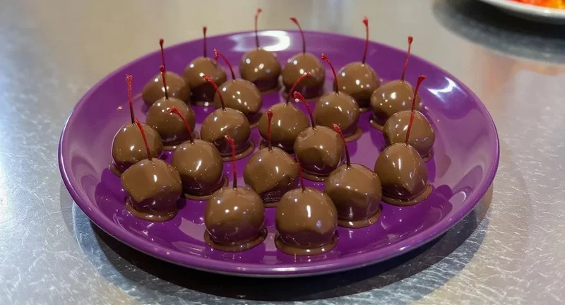 Вишню для коктейлей замочить на 20 минут в коньяке (роме), а можно и не замачивать, тут уже дело вкуса. Откинуть на бумажное полотенце и обсушить.