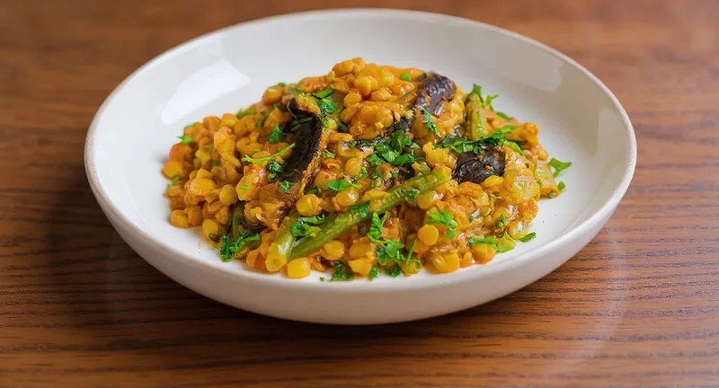 3. Обжаренные овощи смешать с чечевицей выложить в форму для запекания, добавить помидоры, влить сок и поставить в разогретую до 180С духовку на 15-20 минут. Минут за пять до окончания приготовления добавить соль и все специи, мелко порезанные чеснок и петрушку.