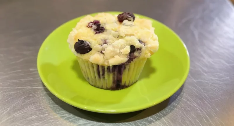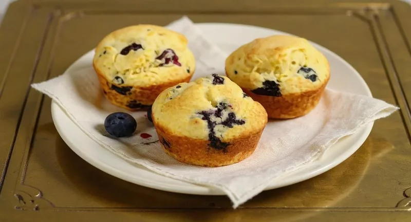 В большой миске смешать вместе муку, кукурузную муку, разрыхлитель и соль. Постепенно добавить поочередно мучную смесь и молоко в тесто, начиная и заканчивая мукой. Аккуратно добавить 1,5 чашки черники. Ложкой разложить тесто по ячейкам и посыпать оставшимся сахаром.