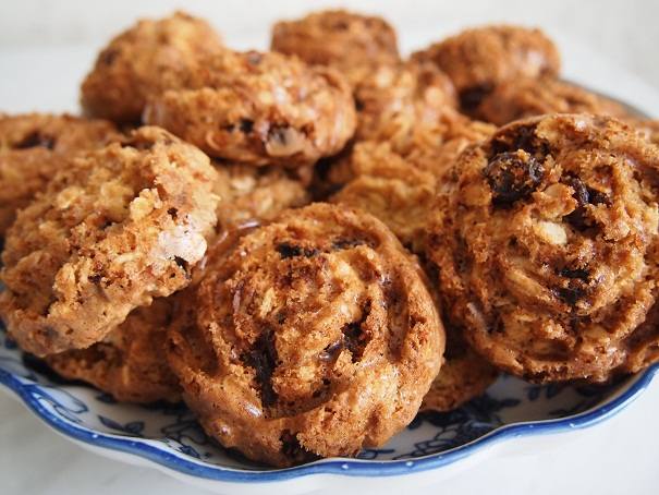 Отдельно смешиваем муку и овсяные хлопья. Выливаем в муку яично-масляную смесь, добавляем изюм и все хорошо перемешиваем.
