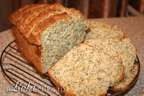 В миске смешиваем муку, соду, пекарский порошок, соль, сахар, орешки, кунжут и мак. Хорошо перемешиваем. Затем заливаем всё кефиром и очень быстро смешиваем. !!! ДОЛГО НЕ МЕШАТЬ!!! Поскольку сода и пекарский порошок очень быстро вступят в связь с кефиром и пойдёт процесс рыхления теста ( что даёт хлебу пористость). А если мы будем долго мешать, то хлеб получится очень плотным ( правда всё-равно вкусным ) Итак, мы быстро смешали и выкладываем в смазанную маслом формочку ( в моём случае форма для кекса). Сверху зубочисткой можно сделать небольшие бороздки, чтобы потом было удобно резать хлеб. Выпекаем при 180 градусах примерно 1 час ( можно проверить на готовность при помощи зубочистки) Получается очень вкусный хлеб nyam, а главное "быстрый".