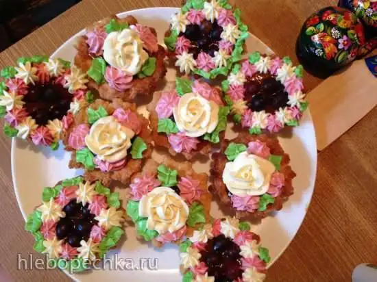 Добавить яичные желтки, муку, ванилин, соду, гашеную уксусом. Замесить тесто. разложить в металлические формочки - корзиночки не чересчур тонко! При очень тонкой раскладке теста - корзиночки будут ломаться! Выпекать по 7 шт. на нижней решетке прогретого (5 мин. при 250*) аэрогриля. Температура выпечки 210*, время - 9 мин. После выпечки извлечь корзиночки из формочек, постукивая по перевернутой формочке чайной ложкой. Наполнить джемом, ягодами, кусочками фруктов. Украсить любым кремом. На фото - корзиночки с абрикосовым джемом и крыжовником. Крем Масляно-белковый https://hlebopechka.ru/index.php?option=com_smf&topic=93207.0.