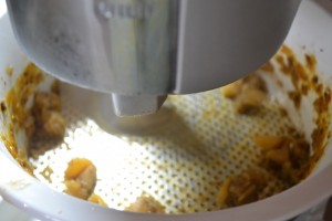 Переложить овощи в сито и протереть в миску. Я использовала для протирки насадку к комбайну сито-протирку – очень быстро и качественно протирается. А можно и просто толкушкой обычной протереть овощи до пюре.