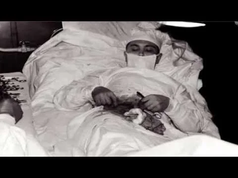 "Я не позволял себе думать ни о чем, кроме дела... Мои бедные ассистенты! В последнюю минуту я посмотрел на них: они стояли в белых халатах и сами были белее белого. Я тоже был испуган. Но затем я взял иглу с новокаином и сделал себе первую инъекцию. Каким-то образом я автоматически переключился в режим оперирования, и с этого момента я не замечал ничего иного."