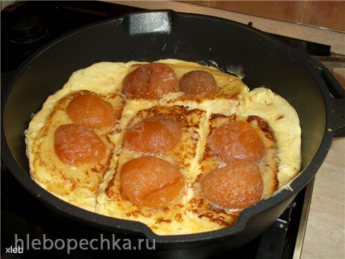 Обжариваем до румяной корочки уложенные куски хлеба только с одной стороны. Затем переворачиваем на другую сторону, сверху на каждый кусок выкладываем немного варенья, либо ягоды из него (как у меня абрикос из варенья), и заливаем оставшейся яичной смесью. Приподнимите каждый кусок хлеба, чтобы смесь проникла и под хлеб.