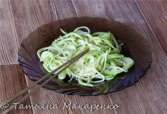 Готовую нарезку кабачка помещаем в маринад, даём настояться буквально несколько минут и можно кушать. Через пару часиков, салат доходит до полной готовности во вкусе.
