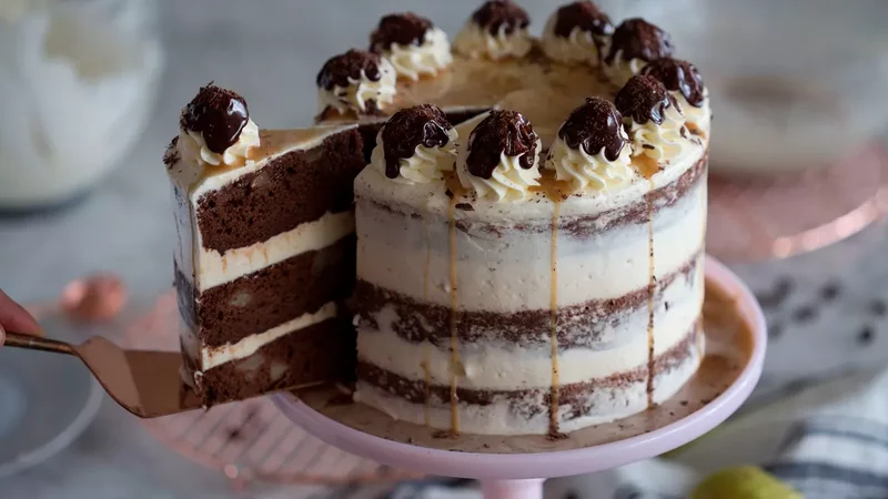 Собирайте торт, промазывая коржи и выкладывая на них груши. Я выложила груши не во все слои, а через раз.