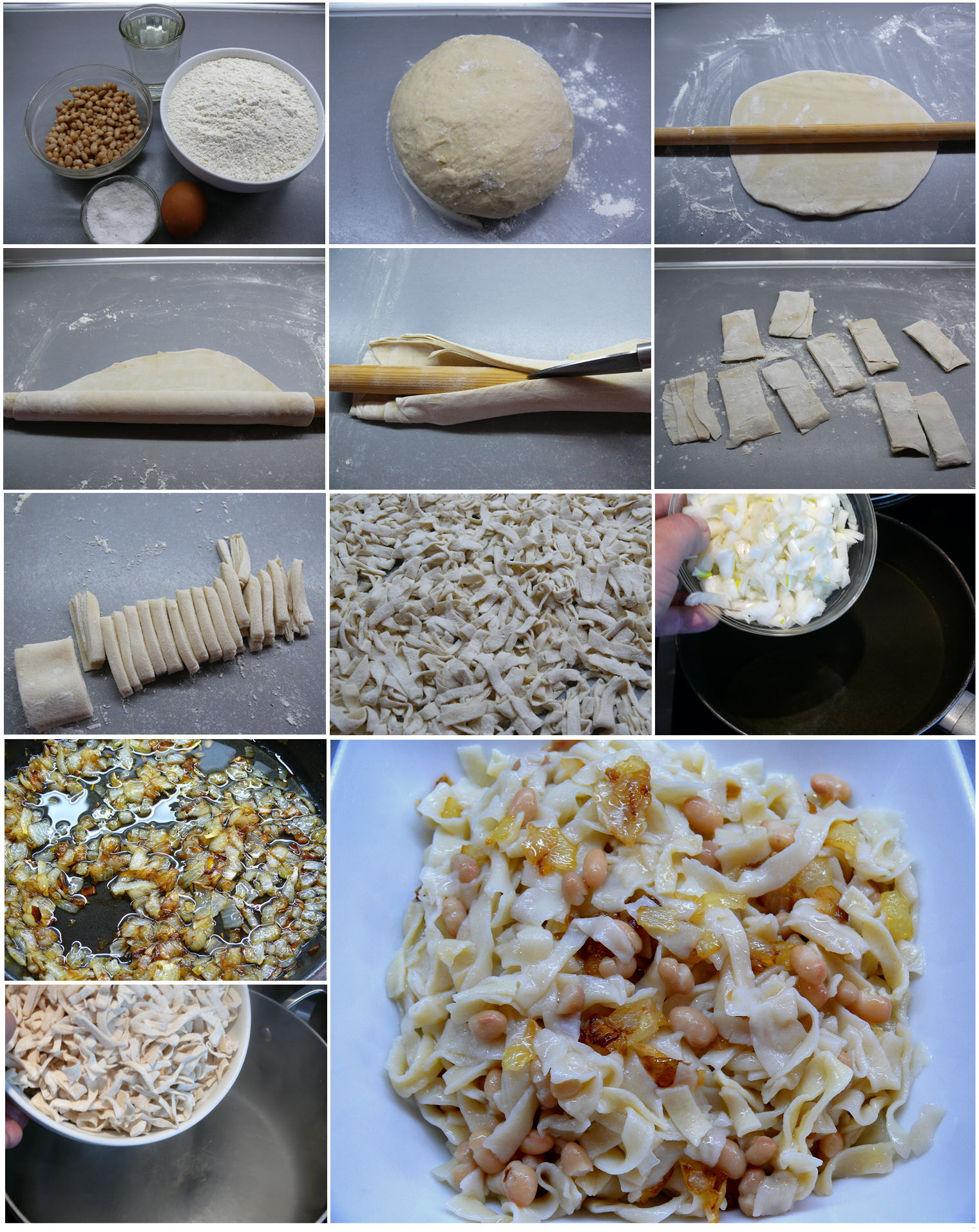 Из трех стаканов муки, одного яйца, воды и соль замесить тесто ( тесто должно получится эластичным не сильно крутым). Доем тесту отдохнуть 30 минут. Тем временем подготовим консервированную фасоль, нужно слить всю жидкость и промыть под струей воды. Отставить в сторону. Тесто отдохнула, готовим лапшу. Теста раскатываем и нарезаем ( Лапшу можно сделать также и Лапшерезки - тестораскатки) Кому как удобно. Лук нарезаем и жарим в сковороде на разогретом масле до золотистого цвета. Ставим на огонь кастрюлю с водой, даем закипеть солим. В кипящую воду погружаем лапшу. Варим до готовности. Сливаем воду. Жареный лук, фасоль, лапшу соединяем и перемешиваем. Выкладываем в тарелку и посыпаем при желание черным перцем крупного помола.