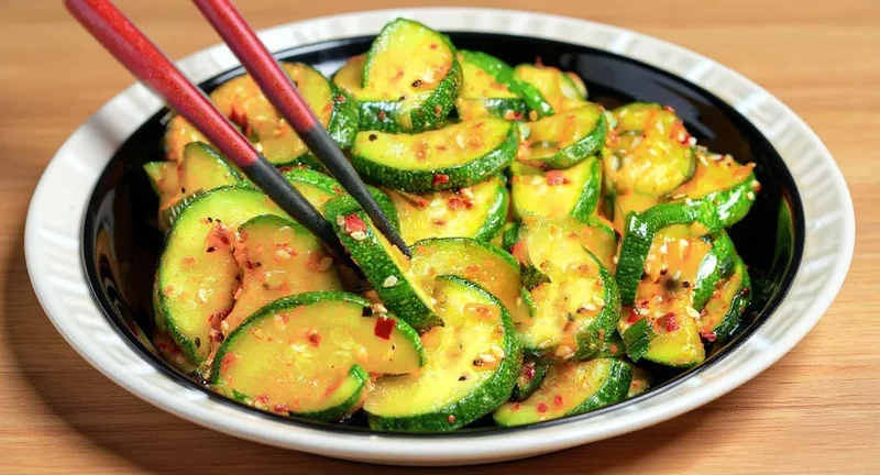 Кабачки лучше взять молодые, с тонкой шкуркой. Нарезать их тонкими кружочками. Залить кипятком и оставить их на 2-3 минуты, откинуть на дуршлаг.