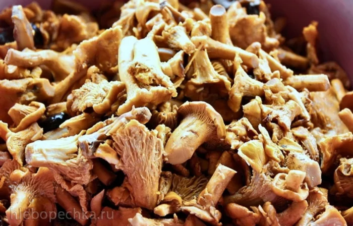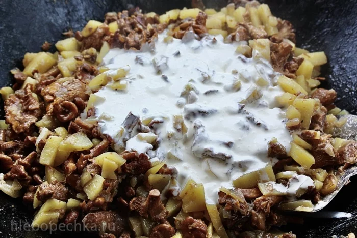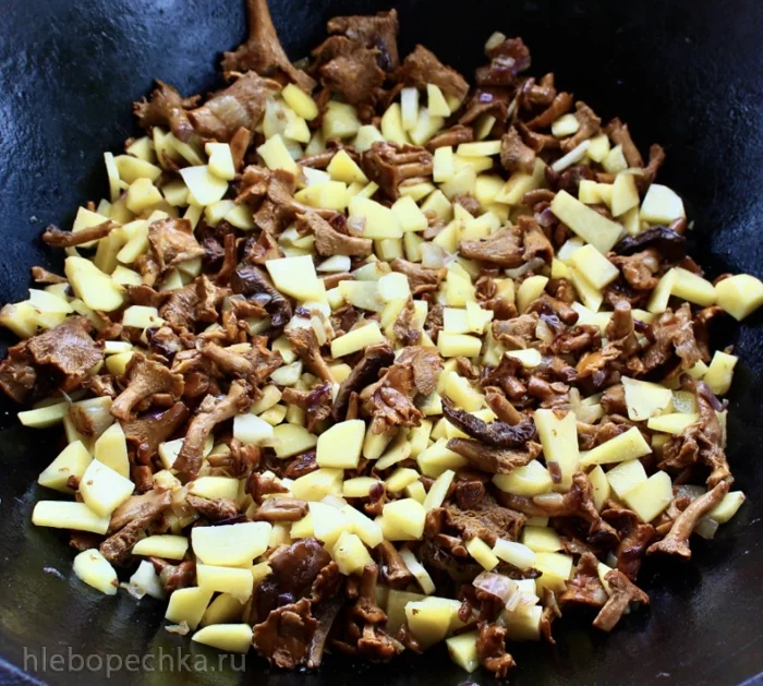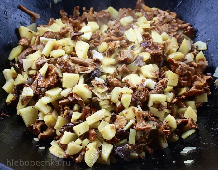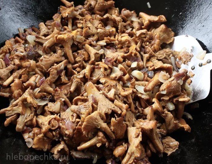 И перемешав ... нет, не так. «Перемешать» тут совершенно не годится. Забудьте про это действие, пока не будут лисички готовы. Вернее будет – «деликатно переворошить» .... И вот так деликатно, очень часто вороша, жарить лисички. Чтобы, значит, лисички не помять – поломать.