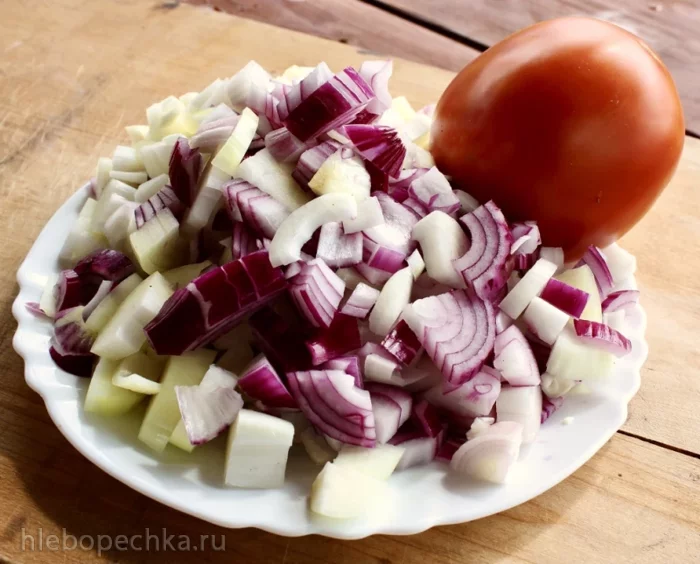 Лучок. Свежий, уже нонешнего урожая. Сочный и резкий. Почистить и нарезать. Лучше кубиками, даже четвертькольцами, в общем, не сильно мелко.
