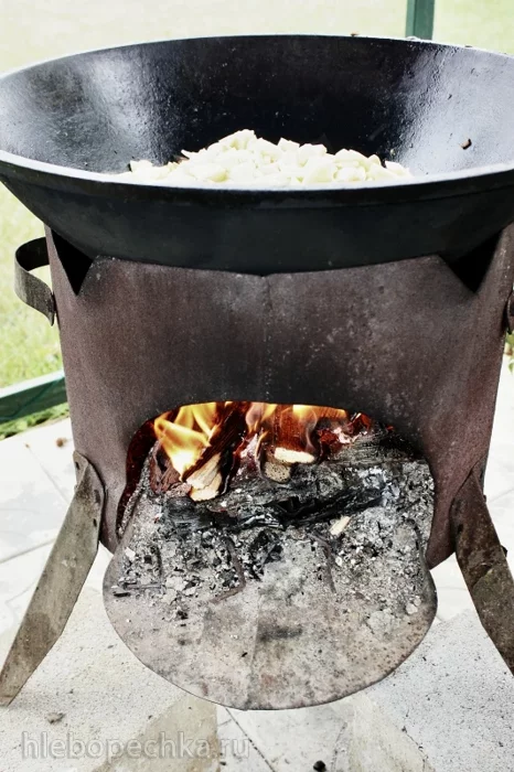 Так вот туда, в казан, выкладываю масло. Ложки три столовые. Больше не надо. А то жирновато получится. Огонь, я еще не раз напомню, держать на щепочках. Никакого сильного пламени. Помните, что масло, хоть и топленое, но не растительное. Нетрудно сжечь. А подгорелое ... чего хотите – будет невкусно. Для того, чтобы топленое масло стало «готово», достаточно пары минут. Вон видите, как шкворчит. Мягко так ... по-доброму. Потому что – плавится. Без пузырей и ..., в общем, правильное масло. Без излишнего содержания пахты. Не говоря уж о каких-то посторонних примесей. А уж аромат ... я вам отвечаю.