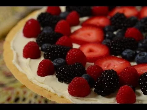 Легкий летний вкусный пирожок на песочном рассыпчатом тесте, оформленный в виде фруктовой пиццы.