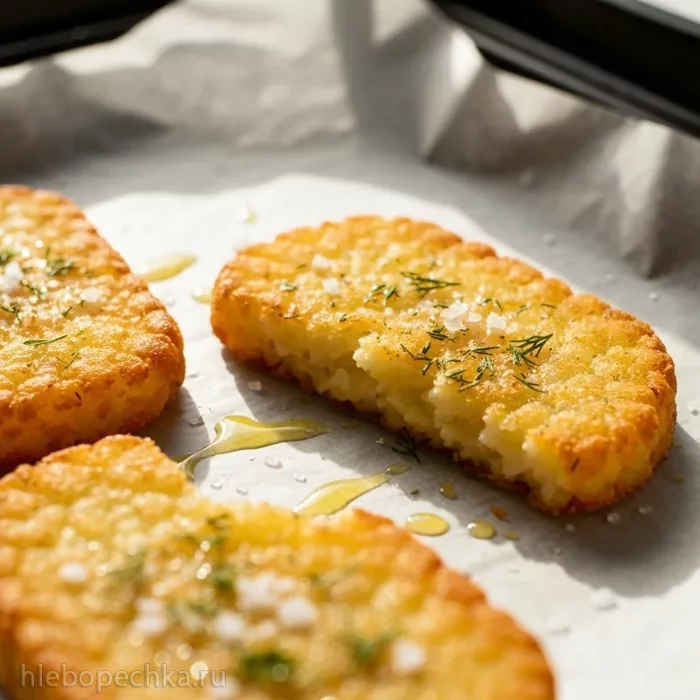 Основная причина неудачных хашбраунов — избыток влаги. Чтобы от нее избавиться, очищенный и натертый на крупной терке картофель необходимо тщательно промыть под холодной водой, пока она не станет прозрачной. Это удалит лишний крахмал и предотвратит окисление. Затем следует самый важный этап: максимально отжать всю жидкость из картофельной массы, используя марлю или чистое кухонное полотенце. В отжатый картофель добавьте оливковое масло, соль, чесночный порошок, сушеный укроп и, что важно, сушеный луковый порошок вместо свежего, чтобы не добавлять лишнюю влагу. Сформируйте из массы плоские котлетки и выложите на противень, застеленный пергаментом. Запекайте при 200°C 30 минут, затем переверните и готовьте еще 15-20 минут до уверенной золотистой корочки. Готовые хашбрауны отлично замораживаются и разогреваются в духовке.