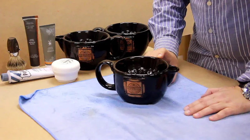 Мой муж бреется станком, на мыльной пене. И уже очень давно у него для взбивания пены термокружка, которая с двойными стенками. Пупырышек на дне, правда, у неё нет, но она большая, на поллитра, стенки из плотной пластмассы. Тепло хорошо держит, как раз на бритьё хватает теплой пенки.