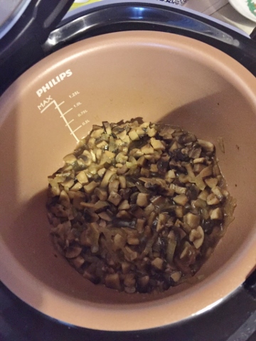 Через пару минут положить порезанный лук, немного обжарить, добавить грибы, готовить с закрытой крышкой периодически открывая и помешивая.