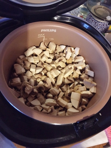 Через пару минут положить порезанный лук, немного обжарить, добавить грибы, готовить с закрытой крышкой периодически открывая и помешивая.