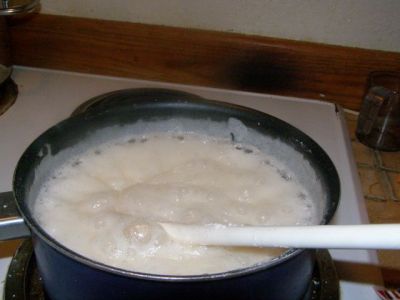 Интенсивно помешивая варим всё это дело 5- минут до такой вот консистенции, оно должно пениться и немного загустеть и поменять цвет, но не сильно а только чуть- чуть как бы темнее станет