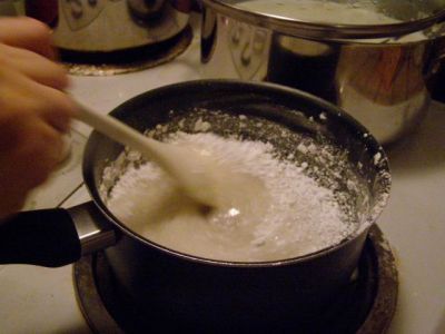 Тогда в эту кипящую массу кладем 4- сар (кружки) без горки сахарной пудры.