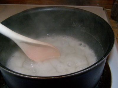 Пока белки взбиваются, берём 1- сар (стакан) холодной воды ставим на огонь в маленькой кастрюльке, и кладем в воду 2- чайные ложки с верхом белого порошка Агар, включаем огонь на средней температуре и непрестанно помешивая доводим до такого вот кипения.