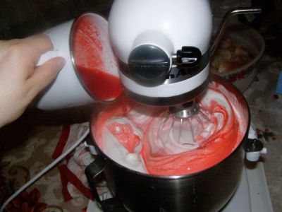 После этого взбивая белки на большой скорости, агар с пудрой прямо с плитки ещё кипящее вливать маленькой струей в белки не переставая взбивать